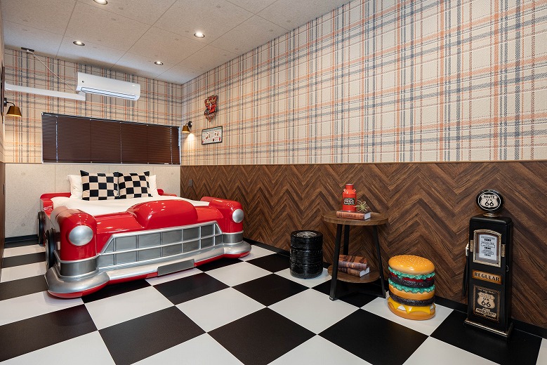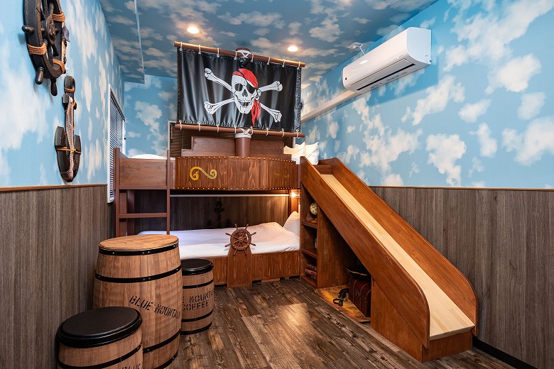 さらに2階には、Sweets Room、Ship Room、Car Room、Space Room といった4種類のコンセプトルームをご用意。大人も子どもも思わず笑顔になる、遊び心にあふれた空間です。大きなドーナツや光るボール、車の形をしたベッドや本物さながらの海賊船など、まるで物語の世界に飛び込んだかのような体験が待っています。ここでしか味わえない非日常のひとときが、皆さまの旅をより特別な思い出へと変えてくれることでしょう。