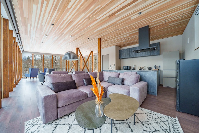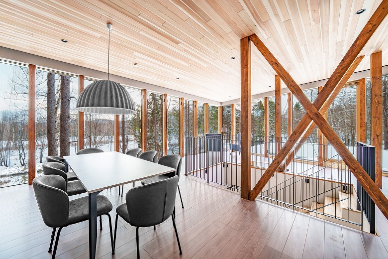 大きな窓から森の景色を取り込み、室内にいながら四季の移ろいを楽しめる空間設計が特徴です。