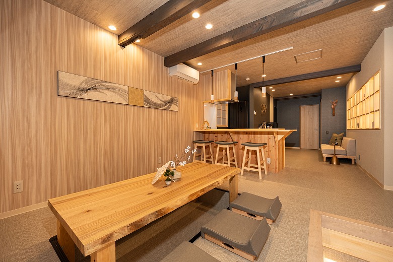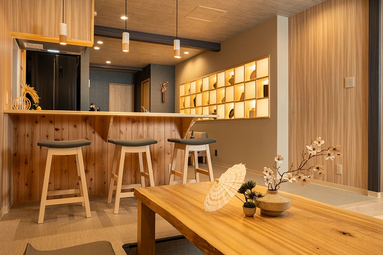 木の温もりを感じる内装や間接照明、和の装飾が調和し、特別感のある空間を演出しています。